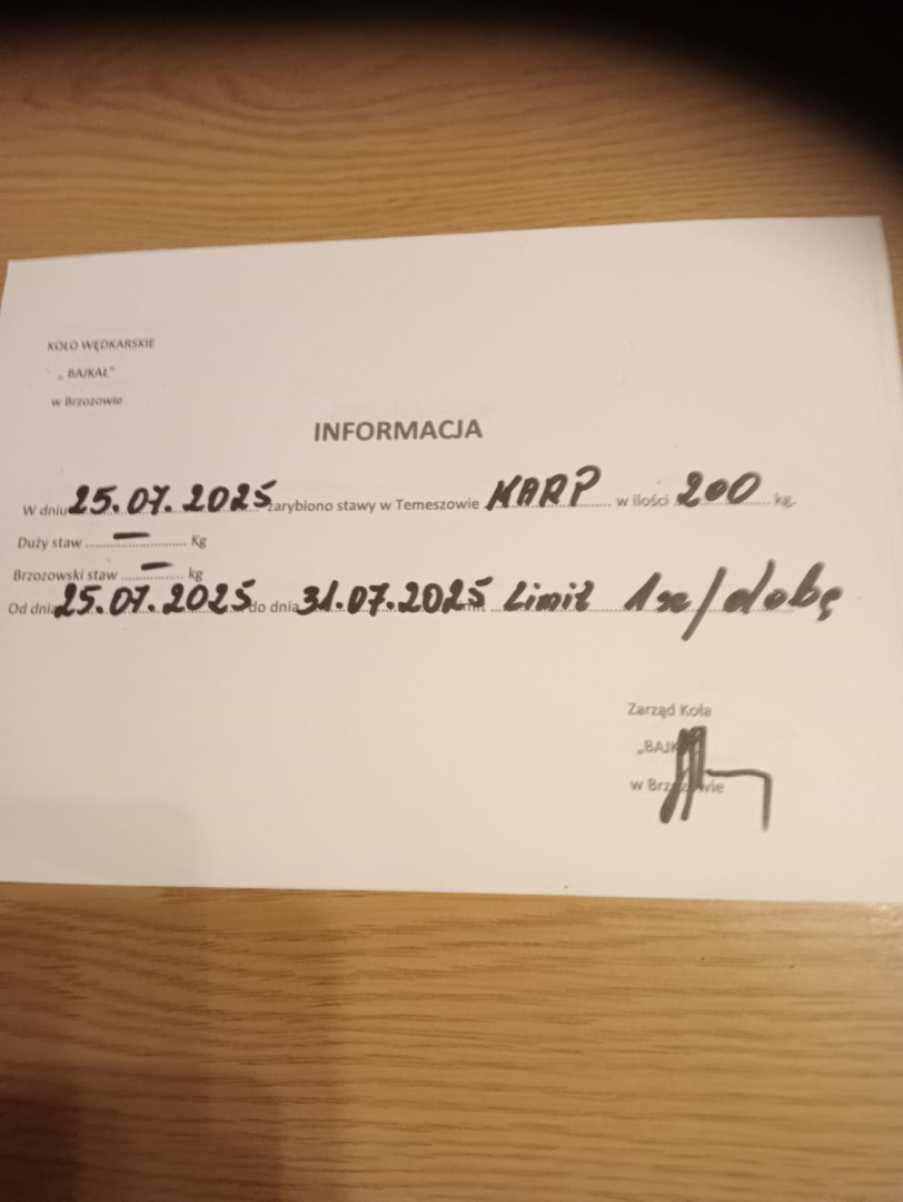W dniu 25-07-2025 Stawy Temeszów zostały zarybione karp 200kg. do dnia 31-07-2025 limit dobowy 1szt.